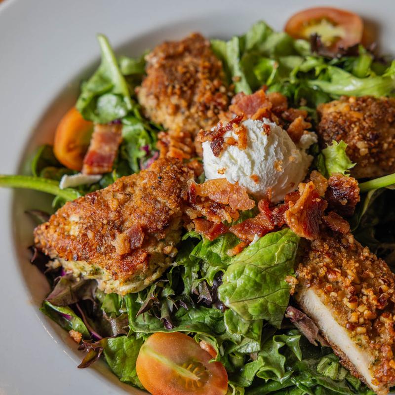 Pecan crusted chicken breast, bacon bits, baby spinach, mixed greens, tomatoes, goat cheese, and bacon vinaigrette.