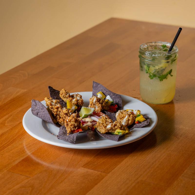 Fried corn chips, pureed black beans, tinga chicken, Monterey Jack cheese, finished with habanero aioli, served with fresh guacamole and house-pickled jalapeños.