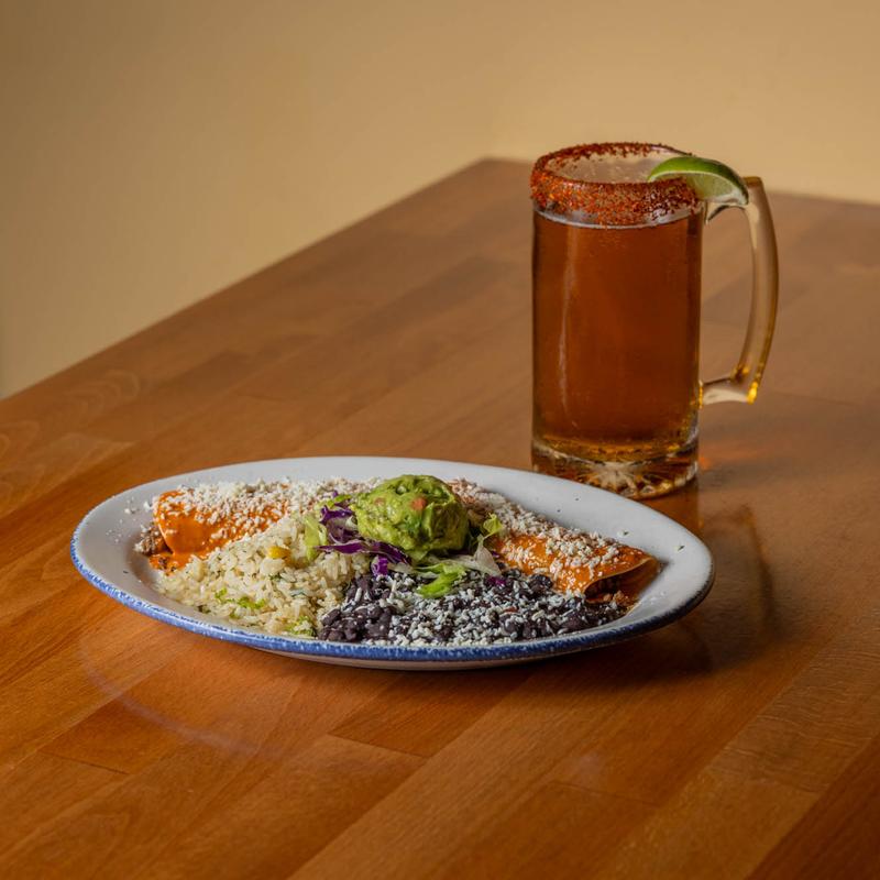 Natural grass-fed ground beef with jack cheese, chile guajillo cream sauce, cotija cheese, and a side of guacamole.