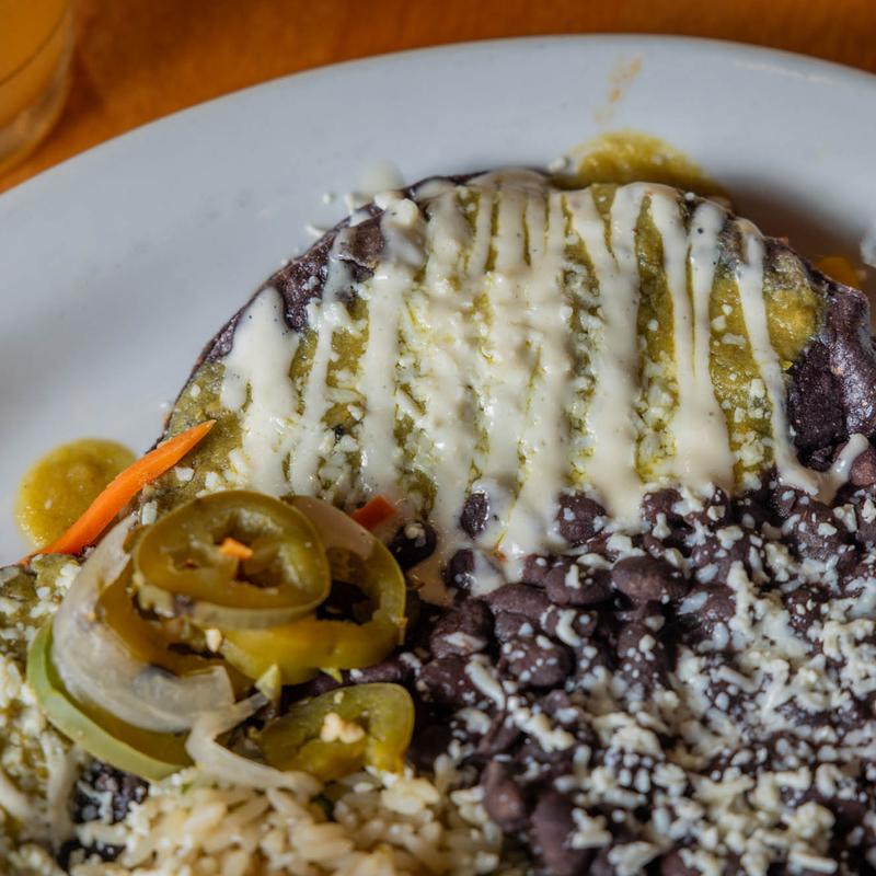 Anaheim peppers stuffed with tinga chicken and Jack cheese, on top of green chile sauce and ranchero cream sauce. Served with beans, veggie rice, a drizzle of sour cream, and cotija cheese.